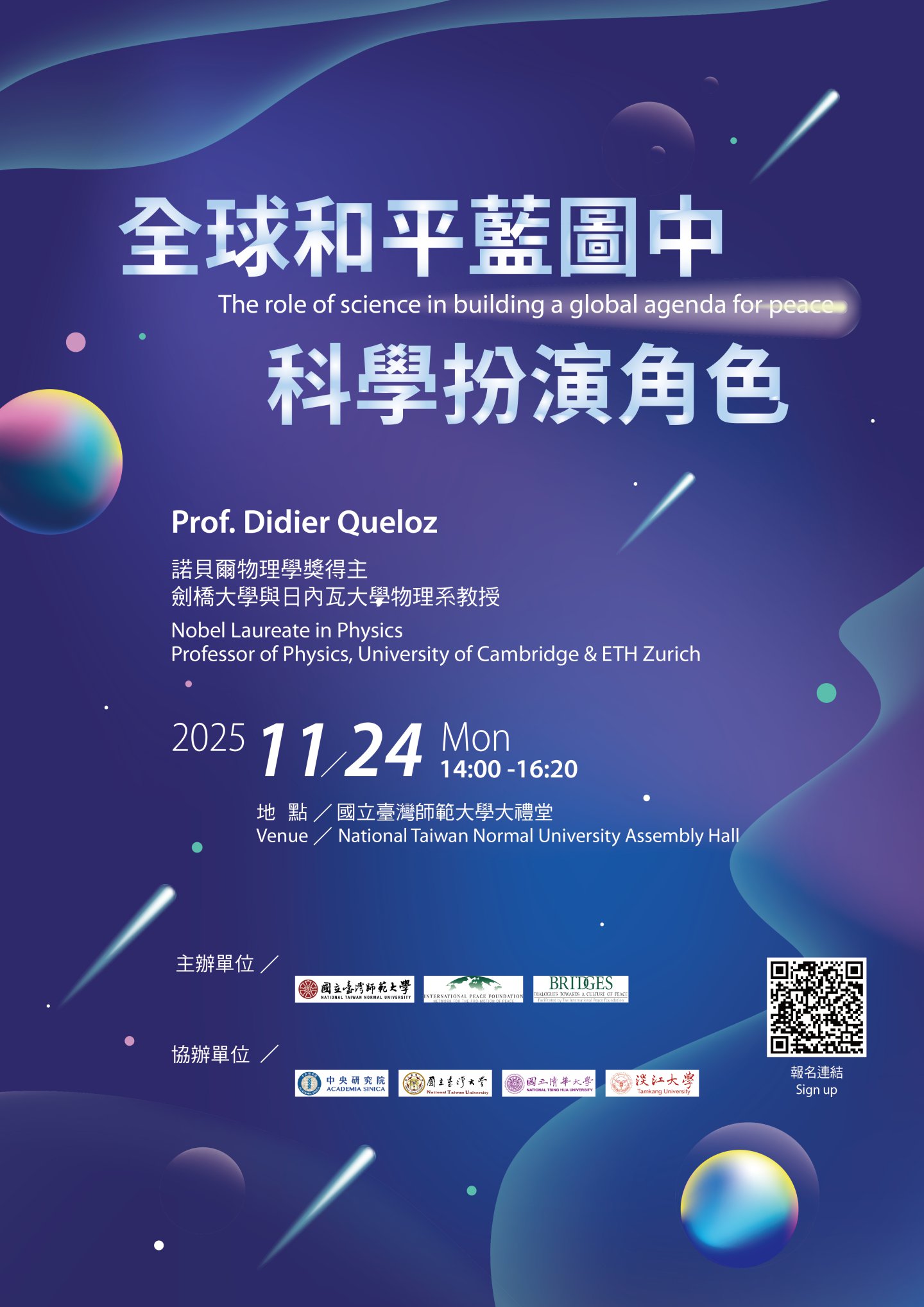 開啟上方區塊 校園新聞-研習資訊:諾貝爾物理學獎得主Didier Queloz教授講座-桃園市立大坡國民中學-陶藝大坡 選擇觀看內容 校園新聞校園資訊網站連結網站FAQ會議記錄 校園新聞 / 內容類型:新聞類型 校園新聞首頁 研習資訊 瀏覽:115 搜尋 選擇校園新聞分類 處室公告校園新聞防疫公告學生專區教師專區政令宣導競賽活動性平專區 選擇內容年度 114年 (2025)113年 (2024) 送出 諾貝爾物理學獎得主Didier Queloz教授講座 研習報名 發佈者:教學組長 / 發佈時間:2025-10-08 / 內容狀態:啟用中 教師專區 研習資訊 教案甄選 內容標籤 特色 2公告 364重要 31學習 91宣導 95比賽 142教學 37課程 76活動 91資訊 61研習 809報名 738節日 3簡介 1注意 18 頁面QRcode 114年「數位科技與人工智慧應用創新教學」學術研討會 「SDGs過程戲劇體驗工作坊(線上)」活動資訊 「114年度桃園市書法教學師資專業成長課程計畫」工作坊 內壢高中辦理「國際教育交流專刊製作及桃園參訪路線規劃研習」 桃園市2026世界機關王大賽教師研習試辦計畫 「教育的跨域創造力:豐碩大學與中小學、幼教、特教及師資生協作之專業資本」計畫線上論壇 觀看更多內容 二、 本場講座擬邀請劍橋大學與日內瓦大學物理學系教授 Didier Queloz擔任講者,講座資訊如下: (一) 時間:114年11月24日(星期一)下午2時至4時20分。 (二) 地點:國立臺灣師範大學校本部大禮堂。 (三) 講題:全球和平藍圖中科學扮演角色。 (四) 報名期間:自114年9月19日至11月19日止(如報名額滿將提早關閉)。 (五) 報名網址:https://forms.gle/ttNbbhuAt3WQjtcF6。 三、 參加本講座者可認證「全國教師研習時數」 研習時數2小時。如有認證需求,請於前開說明二報名網址填寫。 四、 聯絡資訊:02-77491324張先生friend29@ntnu.edu.tw。 內文可瀏覽群組: 註冊會員 訪客 內容附件下載 Download attachment didierqueloz教授講座 檔案下載 校園新聞-相關內容 related information 大園國際高中辦理113學年度「國際教育補助計畫(原SIEP計畫)-政令宣導及實施案例分享研習」 教育部委請國立臺灣師範大學辦理「114年中小學教師專業發展人才培訓輔導計畫」之「講師增能工作坊」 教育雲電子書整合服務平台資源服務提升計畫 「墨藝生活美學樂在桃-113學年度桃園市書法教學師資專業成長課程計畫」研習課程(第二場次) 國立臺灣師範大學辦理114年度「中小學國際教育課程領導者實作工作坊」之實施計畫 國立陽明交通大學辦理「E數位素養講師培訓工作坊—探索數位素養新篇章」活動 114年度教師專業成長研習實施計畫夢的N次方素養工作坊–中二區南投場 桃園市114年「本土語文補充教材開發工作坊(閩語)」 113學年度第2學期美感智能閱讀-安妮新聞種子教師招募計畫 國立臺中教育大學辦理114年1月至2月「原住民族教育師資修習原住民族文化及多元文化教育」實體研習 I want to Test My English 英語自主檢測系統114學年度國中小線上教師研習 國立臺中教育大學辦理「113年度國民中小學沉浸式族語課程觀摩與教學經驗分享」 國立高雄師範大學辦理「PBL-STEMC跨域統整學習扎根計畫」 國立臺灣海洋大學開設「高齡食品」磨課師線上課程,提供「全國教師在職進修資訊網」研習時數8小時 教育部因材網辦理113年暑期活動 ←前往上一頁 前往下一頁→